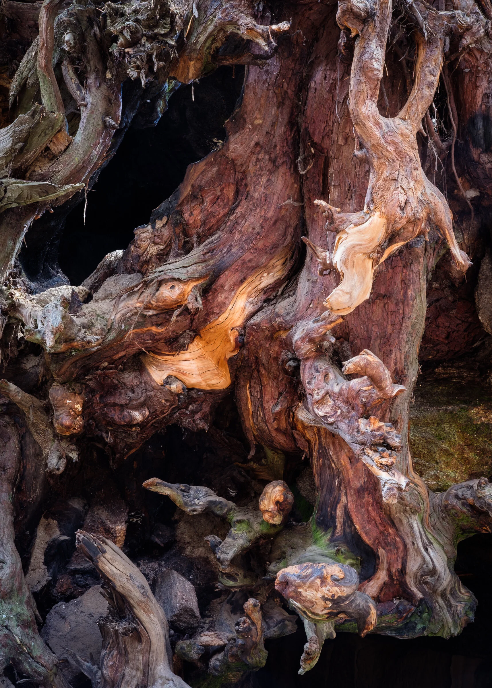 As I made wider view photographs of the draw I noticed a huge tree that had exposed its roots up a short, but steep slope. I heard it calling (something along the lines of, “Hey, stupid! Over here!”), so I huffed and puffed my way upward to take a look. Jackpot! Other than having to make sure I didn’t slip and roll down the hill (I can hear Ann laughing now), it was compose, make an image, find another one, compose, make an image . . . as fast as I could.