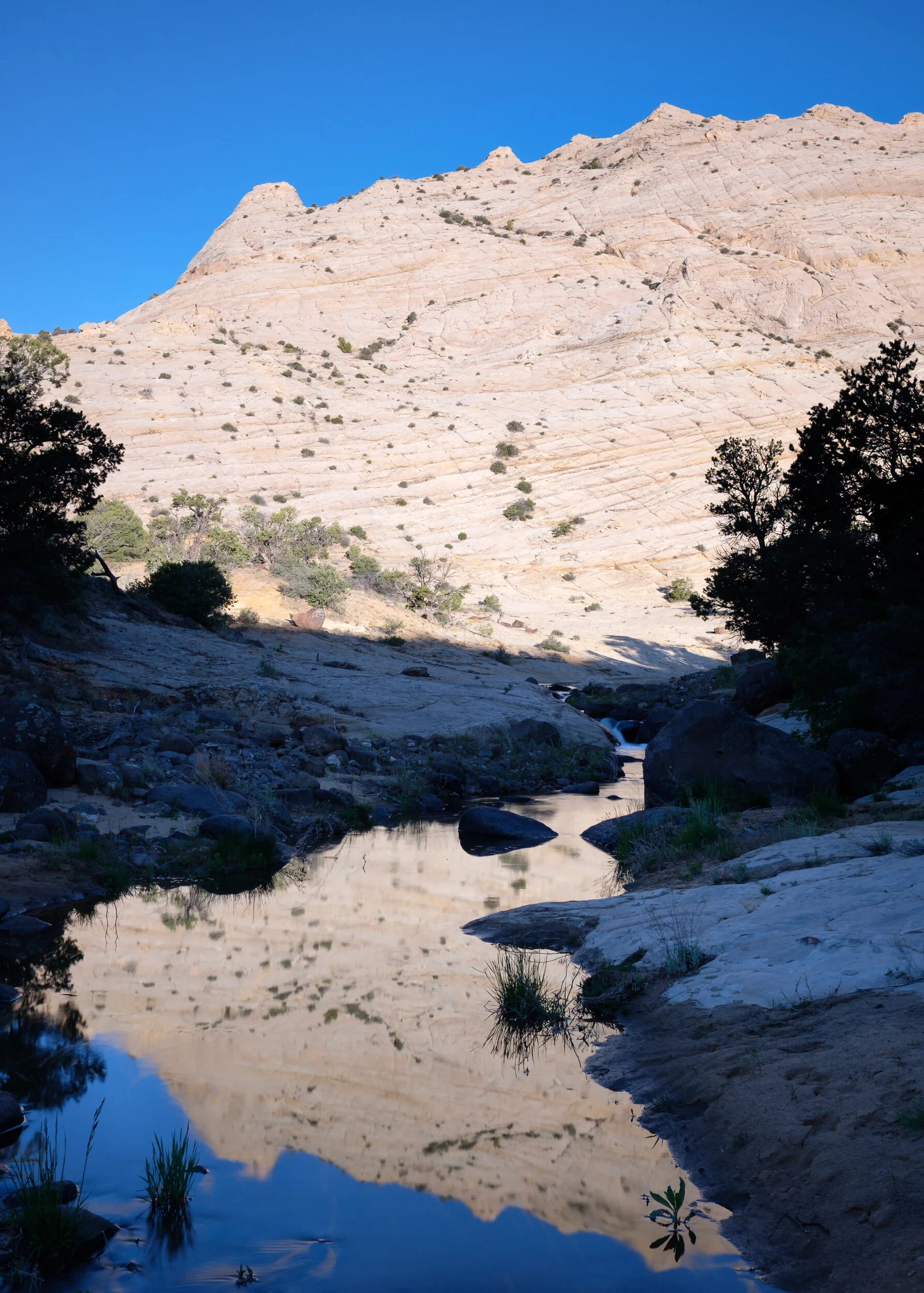 As noted in the previous post, that happened to us along an unnamed tributary to Deer Creek on the Burr Trail. I’d photographed in both directions of the creek and Ann wound up coming over to where I was. She first looked down the stream in the direction I took the first image from the last blog post, but concluded that there was not much there given the harshness of the light from the rising sun. So she turned in the direction of my second photograph.