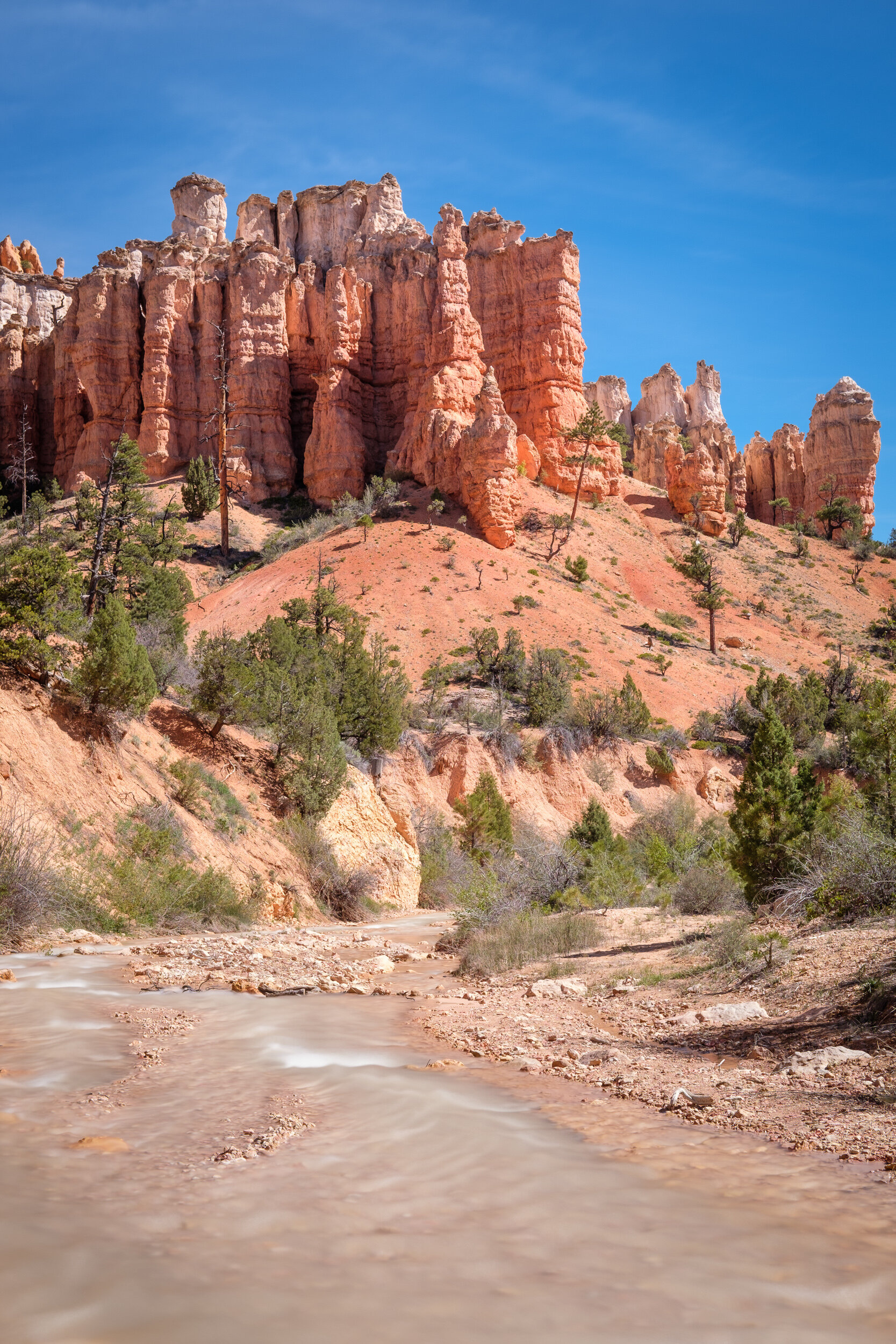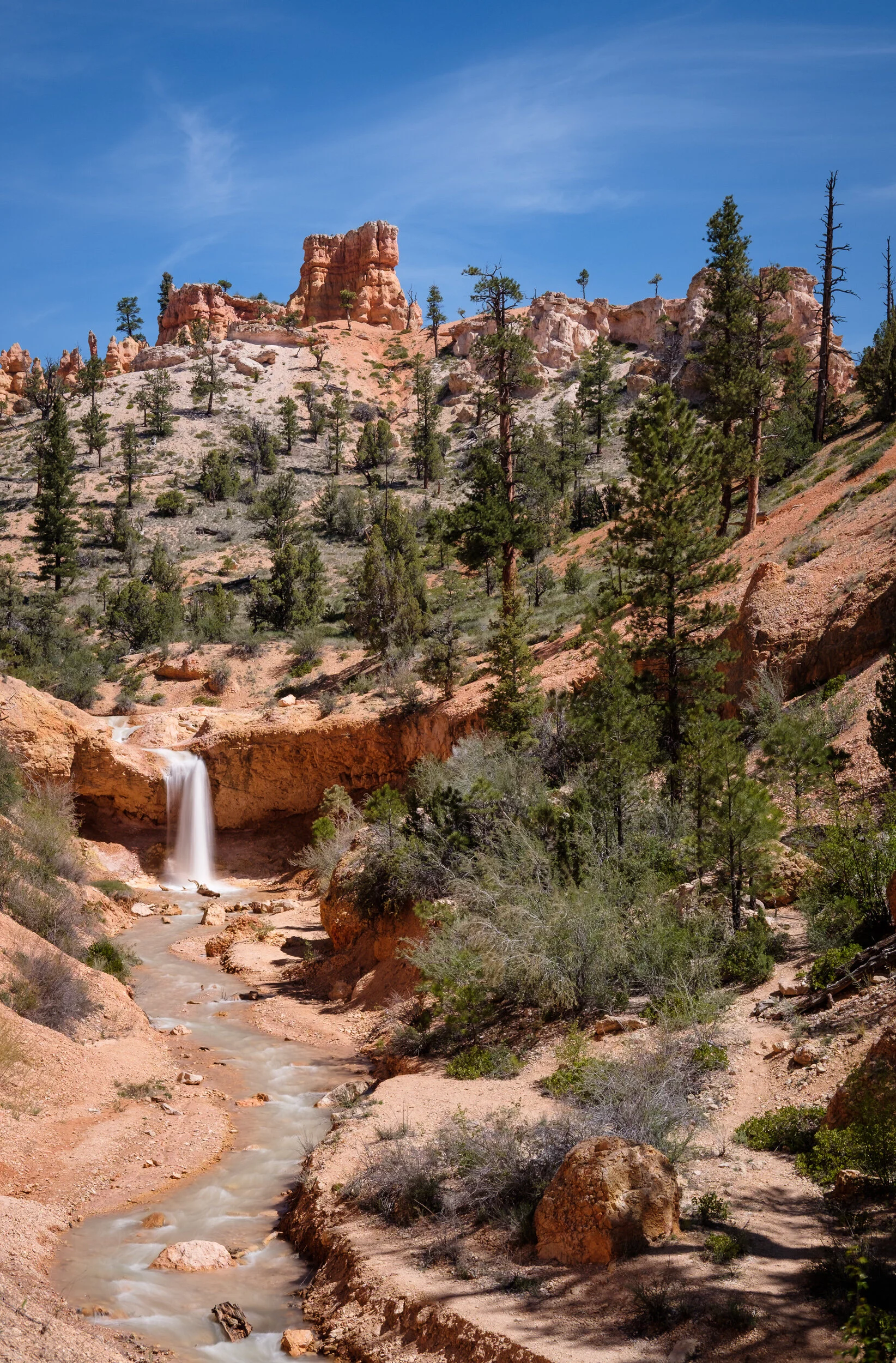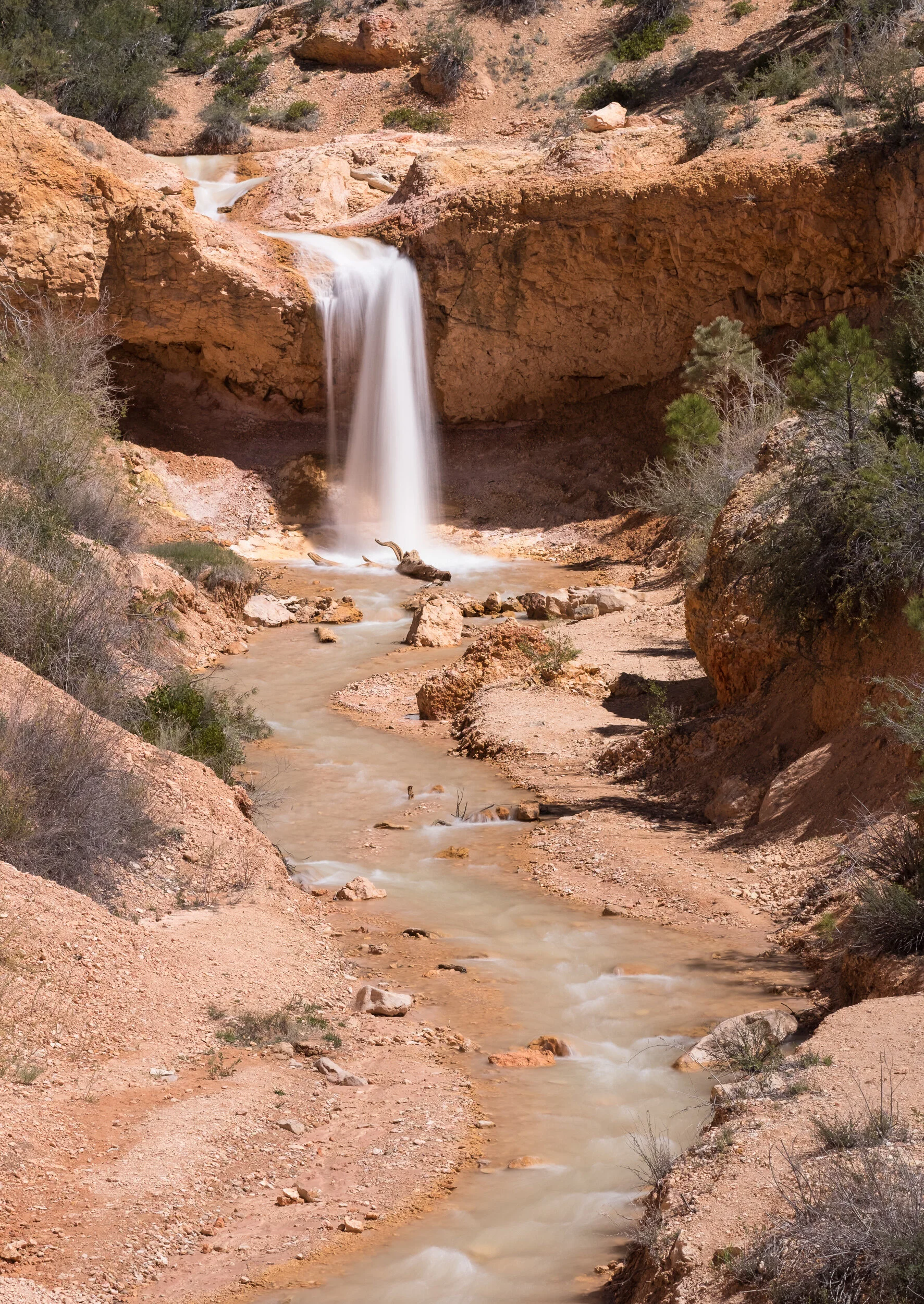 Image making seemed a lot easier that morning than the previous day’s afternoon run through Bryce Canyon. The trail crosses a creek and heads towards a cave and some falls. Ann and I spent a while at the point where the trail crosses the creek. Ann spent time photographing light playing with water as it flowed over a rock. I climbed down into the creek to stand on sand bars or rocks, photographing both up and down stream.