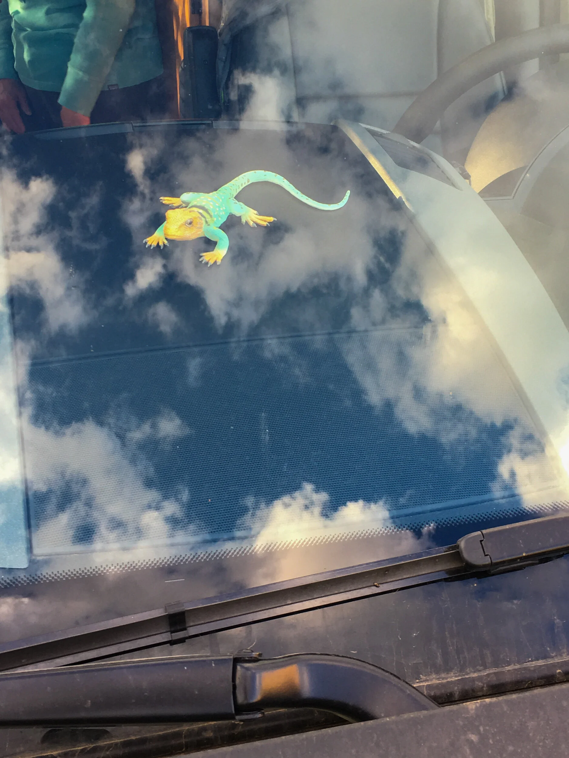 Second, we picked up a traveling companion. Ann made a donation to a local organization’s efforts to preserve the common collared lizard, found in these desert areas, and wound up getting Jack. He now has his own spot on the dashboard and has become our traveling companion, keeping watch over Beast while we out and about photographing and generally keeping an eye on us.