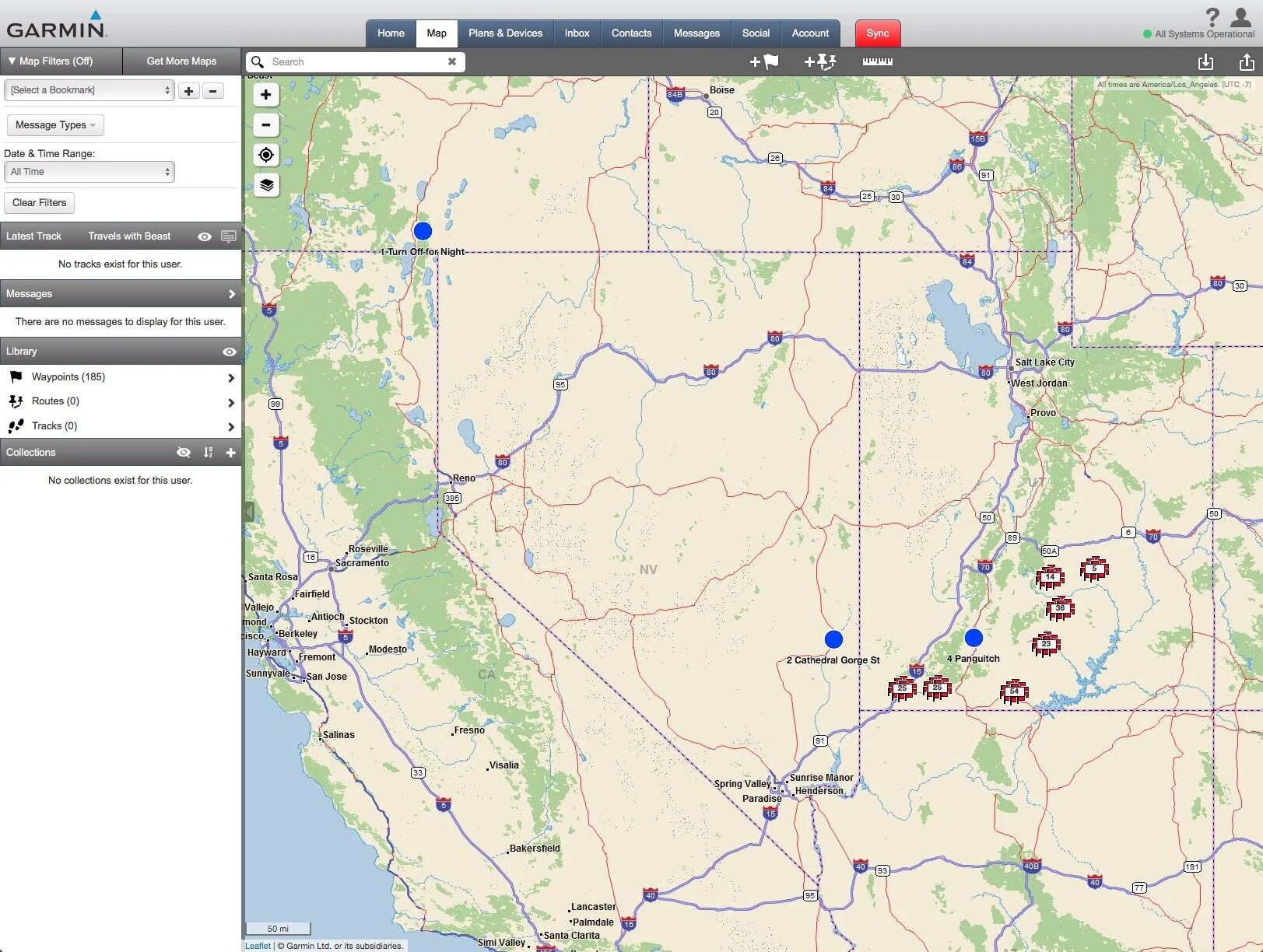 Two things about the menu bar on the left are worth pointing out. First, if you look at the Messages Menu bar (red arrow below) you currently see “There are no messages to display for this user.” If we send a twitter message from the InReach device, it will post here. It will also post on the @BeastTravels page as well. Unfortunately, tweets from our cellphones will not show up on the Garmin site. And, the InReach does not have a camera, so there will be no images with the InReach Tweets. You will, however, be able to click on the message and it will take you to the location the tweet was sent from on the map.
