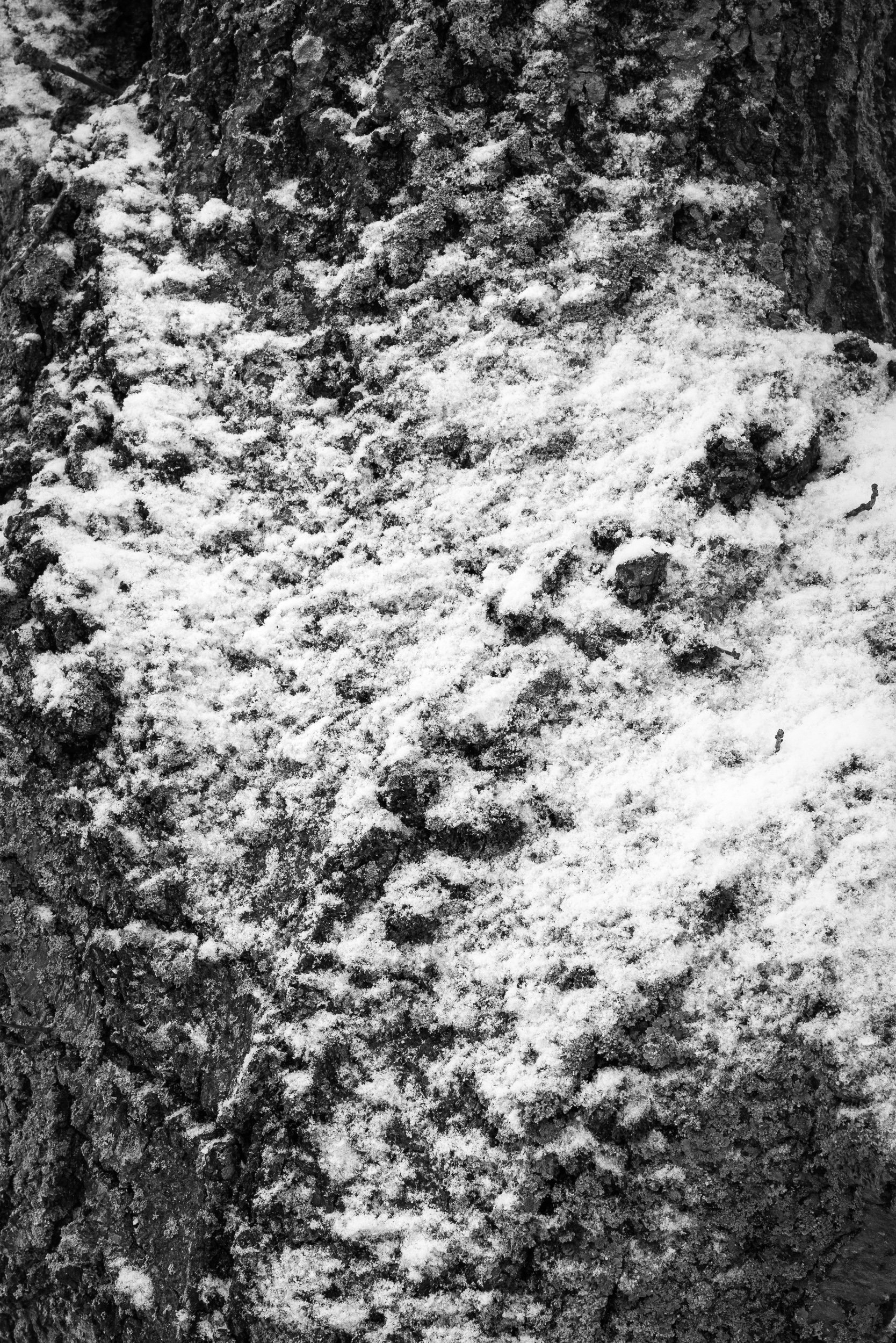 We started out with our usual loop, which really doesn’t offer much in the way of imagery for quite a bit. As we started approaching the woods and was feeling less than optimistic about the prospects for good landscape images, I began to look for closer-up shots. That seemed to do the trick, because not long afterwards, I came across some snow on a tree and started my day with a rather graphic image.