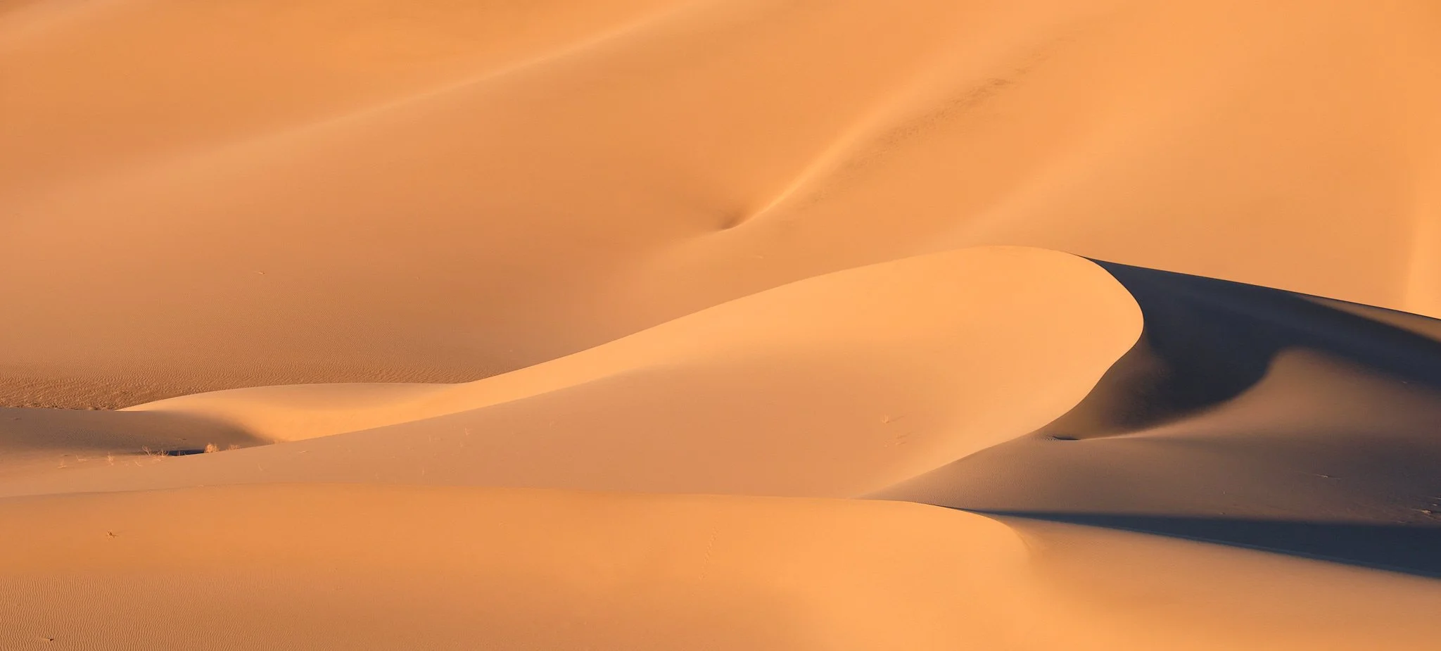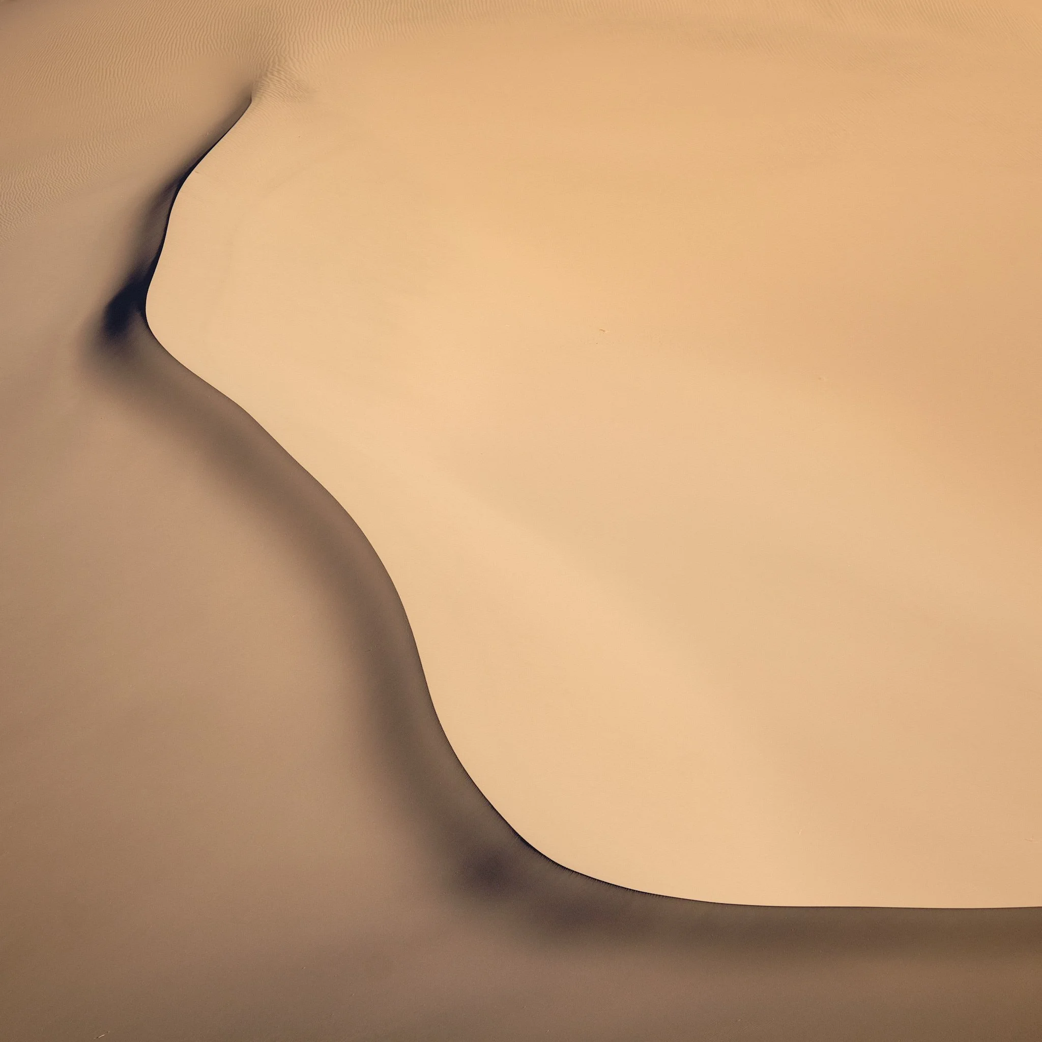 One of the things that is so surprising about prints is that they seem to really reveal the subtleties of shadow coloration in ways that are not immediately apparent when the image is viewed on the screen. For example, in the above image, the shadow of the dune in the foreground is much cooler (bluer) than the shadow right above and adjacent to it (visually) but lying on the background dune. That coloration difference is probably because the foreground dune is oriented upward and is reflecting/is lit by the blue sky more. The same holds true for the image below, though the background dune below has a bit of both, with the shadow on the left side much cooler than the one on the dune side facing you.