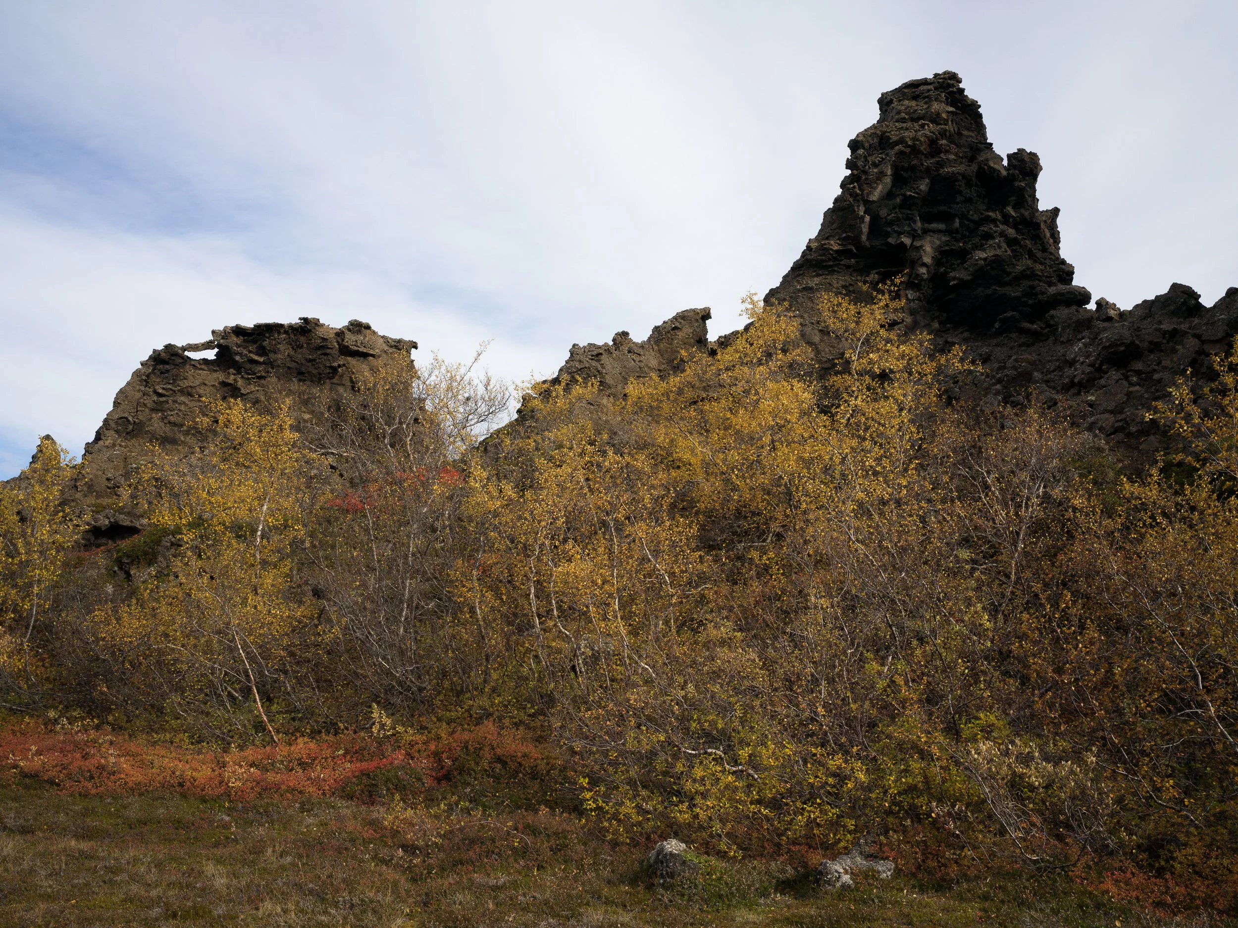 Our next stop was the Dimmuborgir lava field. This time we took our big cameras with us. The trees had already started to turn, and some had already lost leaves to the several storms that had recently hit Iceland. Still, the lava formation landscapes were visually captivating and the different colored trees presented a very stark contrast to the previous all-green vegetation we’d seen the first time we were there.
