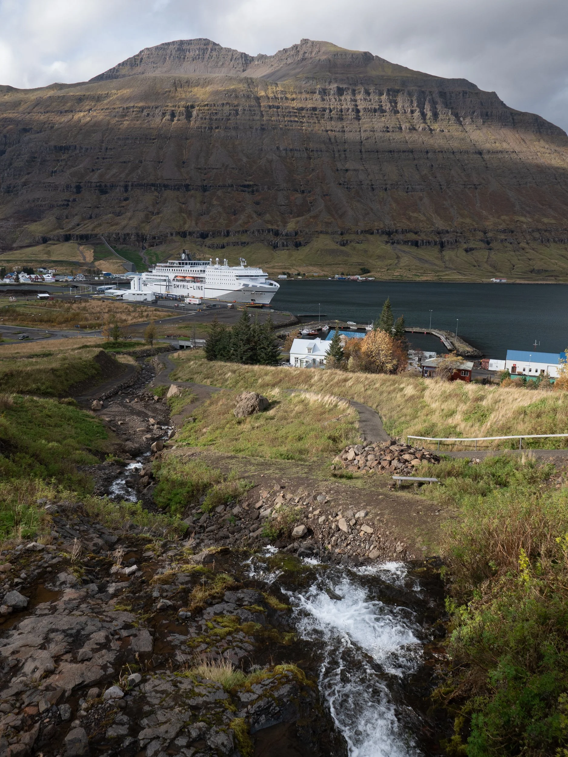 On our second day there we took a long walk to visit a waterfall on the other side of town. Yes, that’s the Great Wall (protecting the city) just to the left of the Norröna. The ship hides where we were parked.
