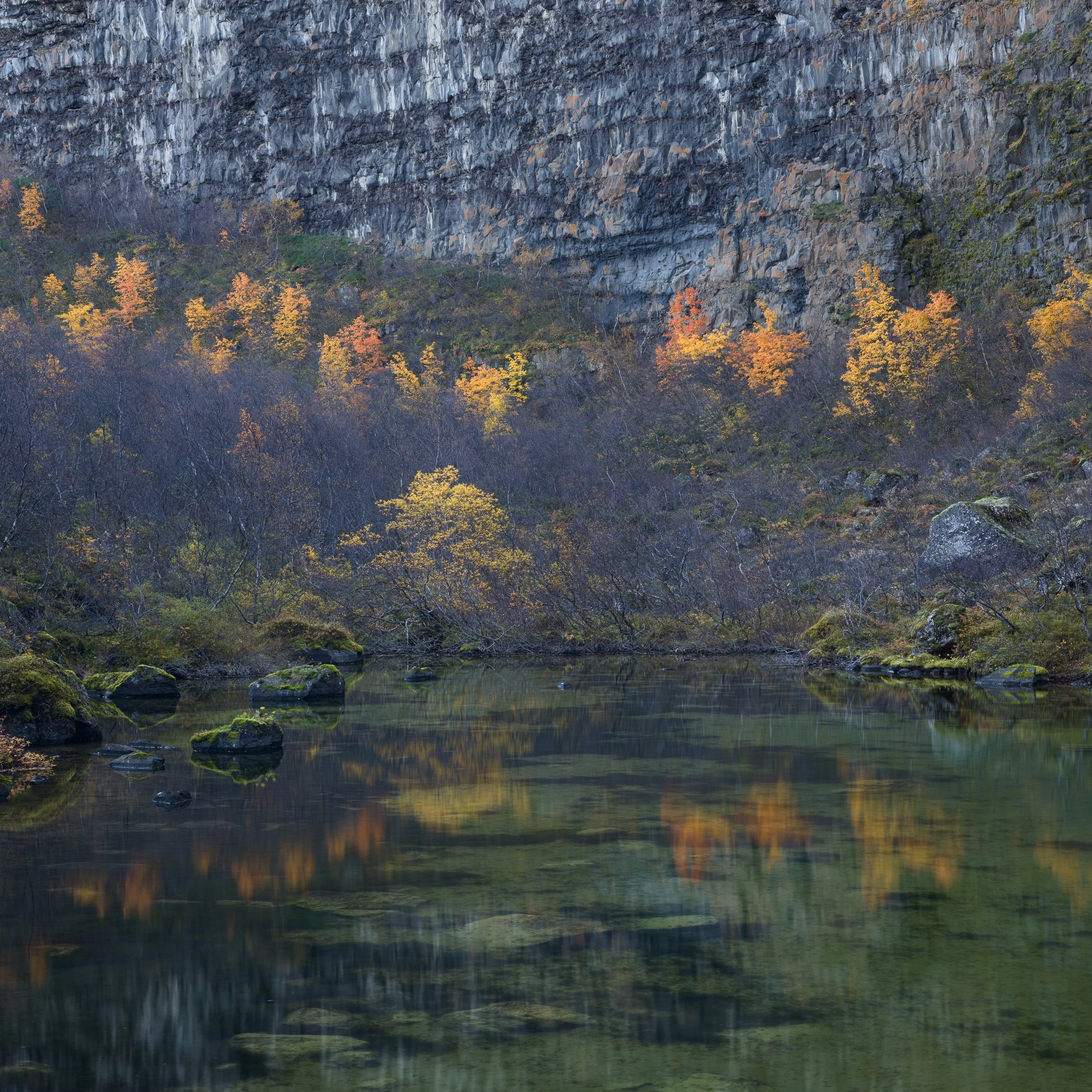 We again camped at the Asbyrgi campground and the next morning headed back to the pond at the end of the canyon where we’d photographed before. This time, fall added some contrasting color, even if it was obvious that we’d arrived a week or two too late for peak color.