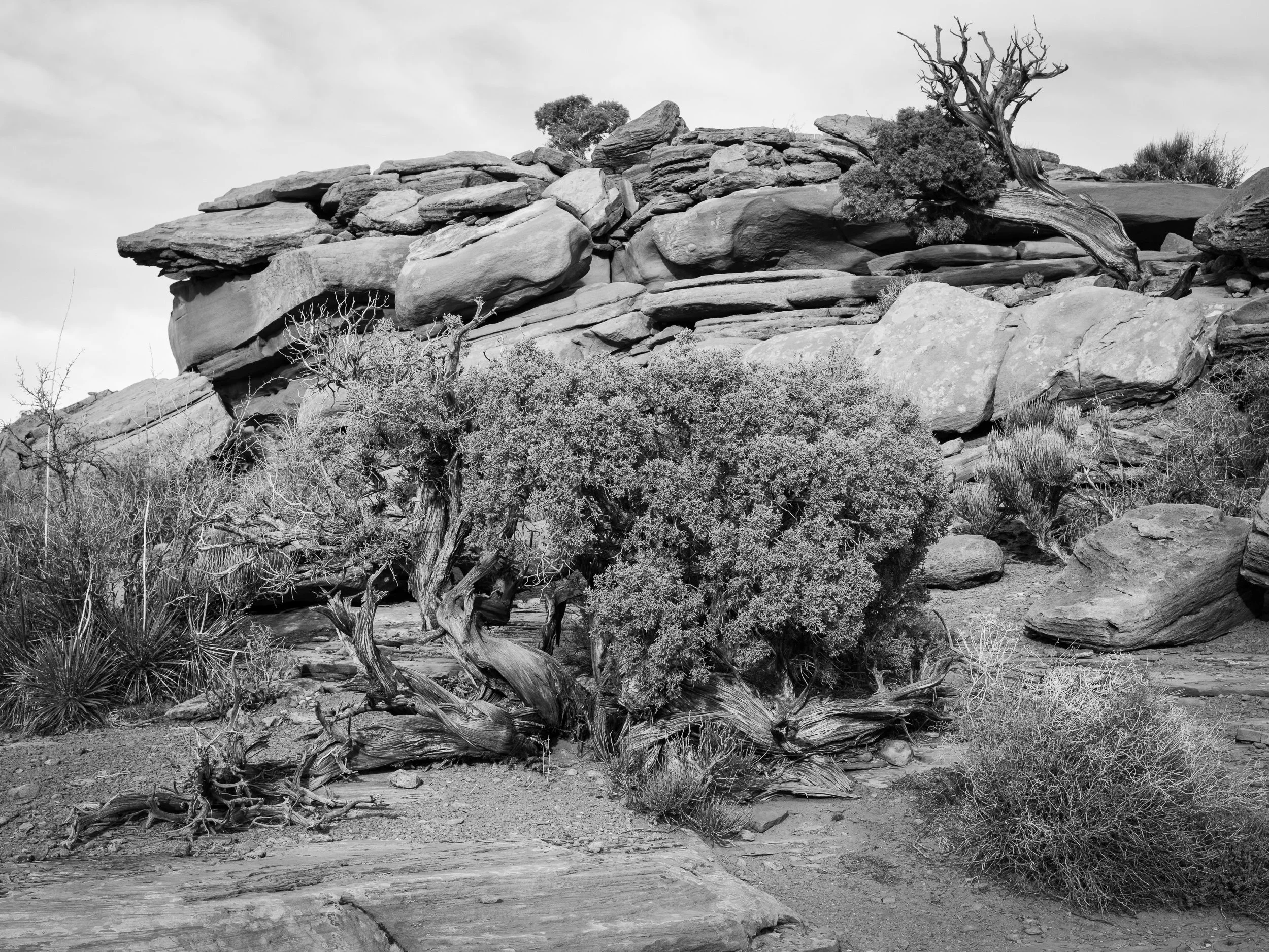 The next image was one of the few that was a pleasant break from viewpoint photography. We’d gotten to a location later in the afternoon, as the clouds started moving in, where we could wander around a bit. Which we did. I eventually made my way out to an uprising of rocks and trees, excited at the prospect of engaging with the landscape for once. It took me a while to find a composition that offered more than a simple glance, but eventually I found one, focused on a good-sized bush (it’s probably a tree), with smaller surrounding vegetation of all sorts, and a backdrop of rocks. In color, it leaves a bit to be desired - nothing about the colors are inviting or enriching (I would have thought the reds of the rocks and the greens of the bushes would complement each other well - shows what I know about color). Believe me, I tried to make the image work in color before and it didn’t. This time around, perhaps because of the previous image, I tried converting it into black and white and . . . it’s better.