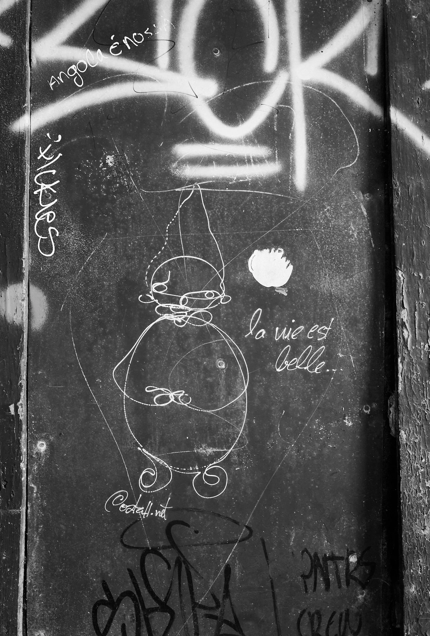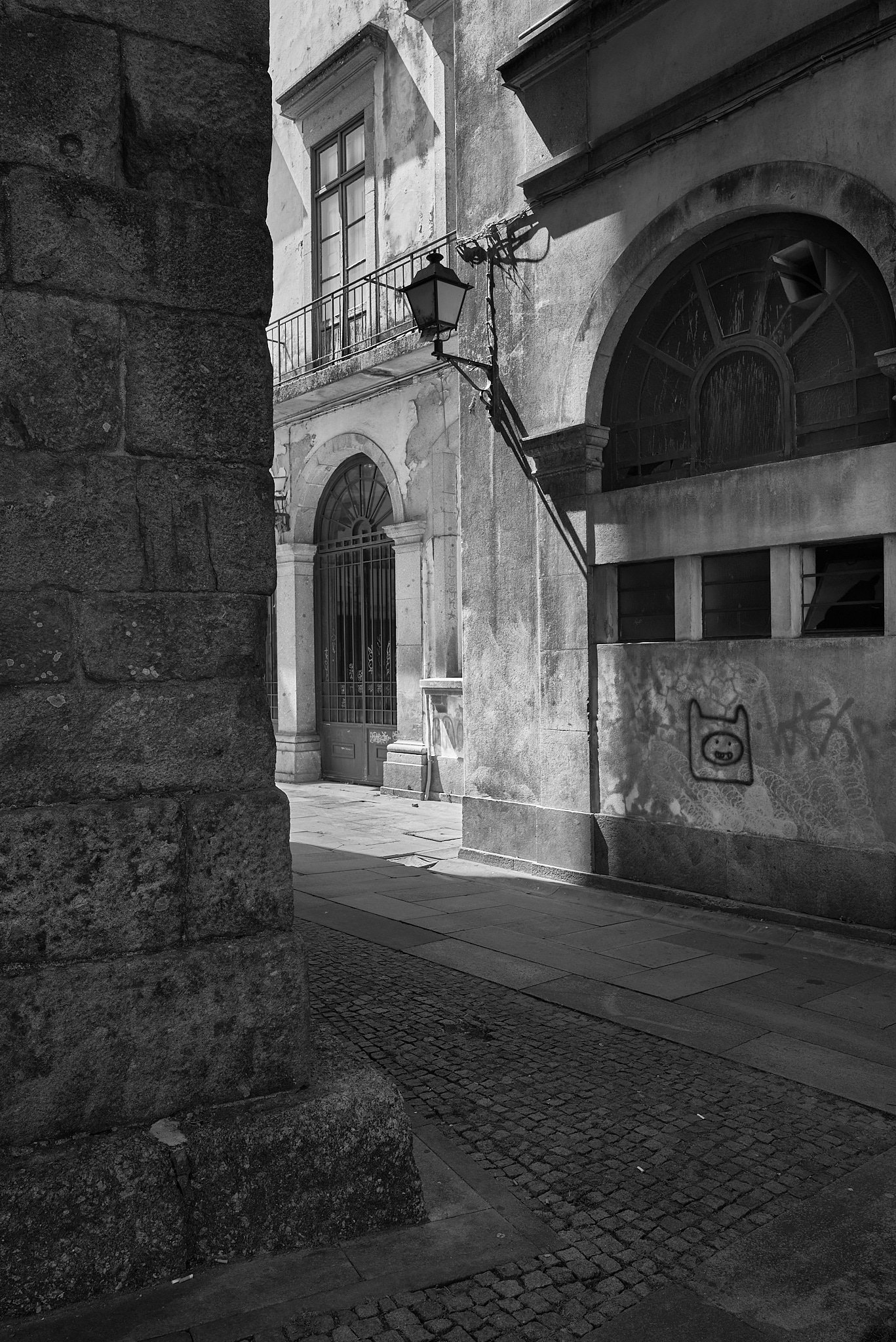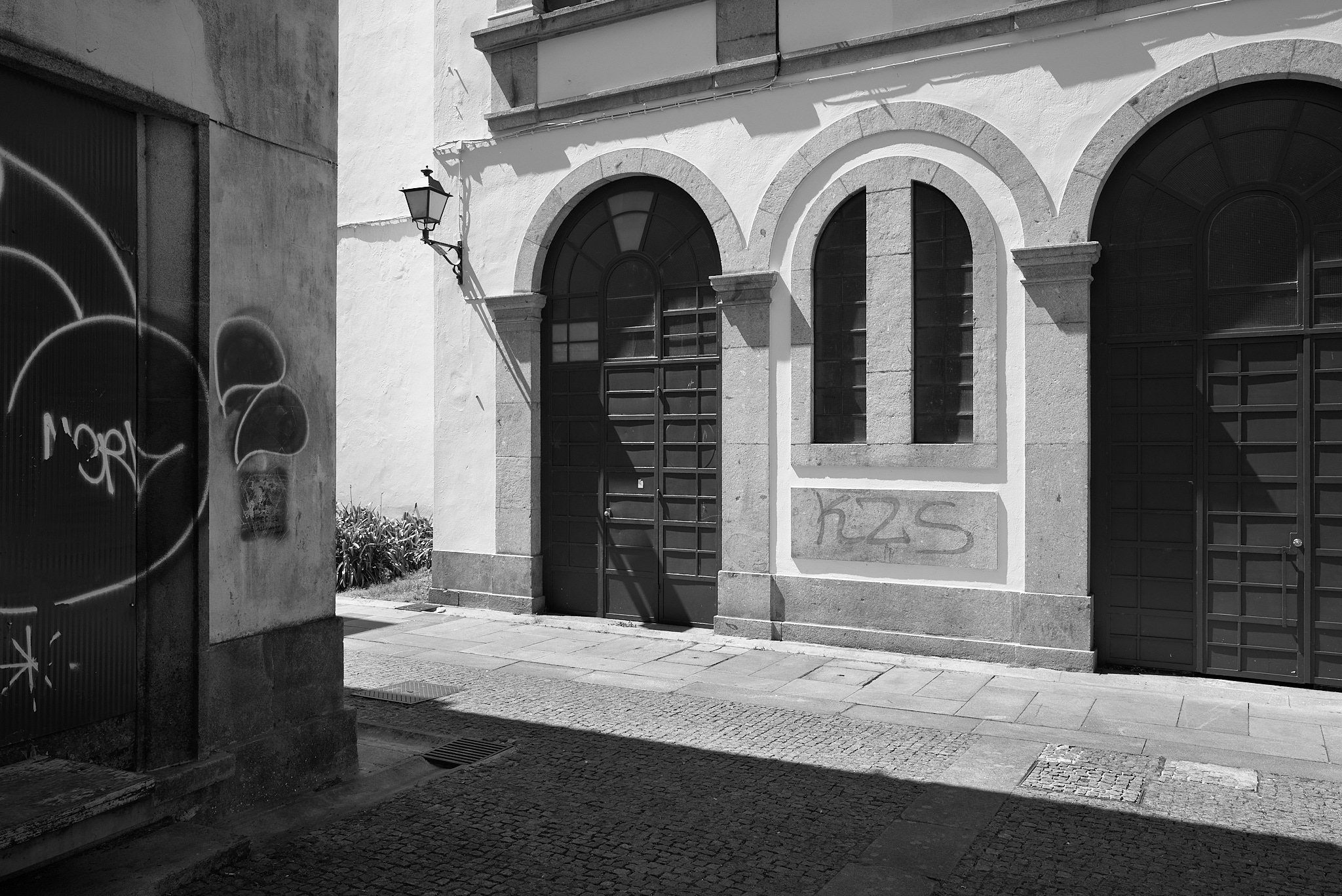 I do know why I made the next image. I’d seen this “VÔ?” tag on several walls as I wandered through town and had no idea what it meant. In Portuguese “vô” means grandmother. I still have no idea what it means. One was written on this lovely mustard colored wall that, well, didn’t work in black and white, and I told myself, “I wish this had some light on it.” Well, a few blocks later I came across this wall, and once I saw the SC Braga uniform sticker in the window, I decided I had to make the image.